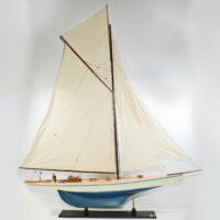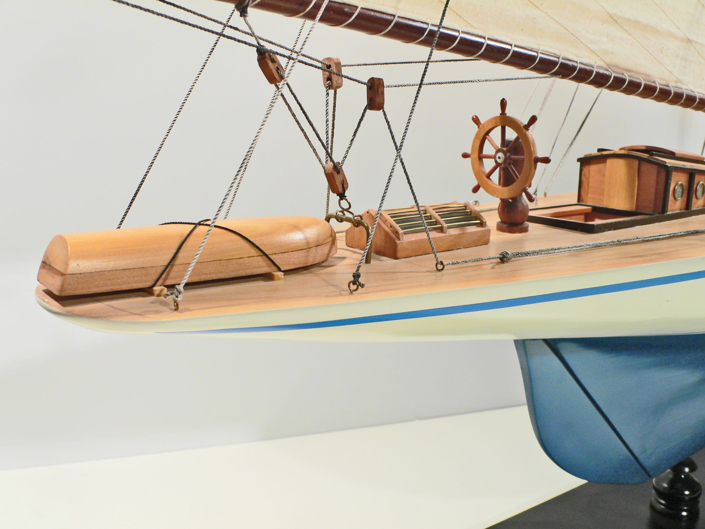 Bei der dargestellten Segelyacht handelt es sich um eine maßstabsgetreue Nachbildung der Defender. Dieses Modell wurde zu 100% in reiner Handarbeit und großer Präzision nach traditioneller Spantenbauweise gefertigt. Dabei finden unter anderem exotische Edelhölzer wie Teak, Mahagoni, Rosenholz oder Mango Verwendung, wodurch sich als Endprodukt ein wertvolles und dekoratives Edelmodell ergibt. Der Rumpf wird nach der Fertigstellung feinsäuberlich geschliffen und sofern vorgesehen lackiert. Anschließend wird das Modell mit einem schätzenden Klarlack beschichtet. Ornamente und Verzierungen (z.B. Bullaugen, Anker, Zifferblätter und Räder …) sind aus Messing, Chrom oder anderen hochwertigen Metallen. Die Segel sind aus Stoff oder Seide, die Masten aus Holz und das Tauwerk aus soliden Baumwollfäden. Manche dieser Seile haben Spezialknoten, mit denen die Seile jederzeit nachgespannt werden können. Unsere Modelle durchlaufen eine strikte Qualitätskontrolle, damit wir Ihnen ein fehlerfreies Produkt bieten können. Die Zufriedenheit unserer Kunden hat unsere höchste Priorität. Alle Modelle werden vollständig zusammengebaut ausgeliefert.