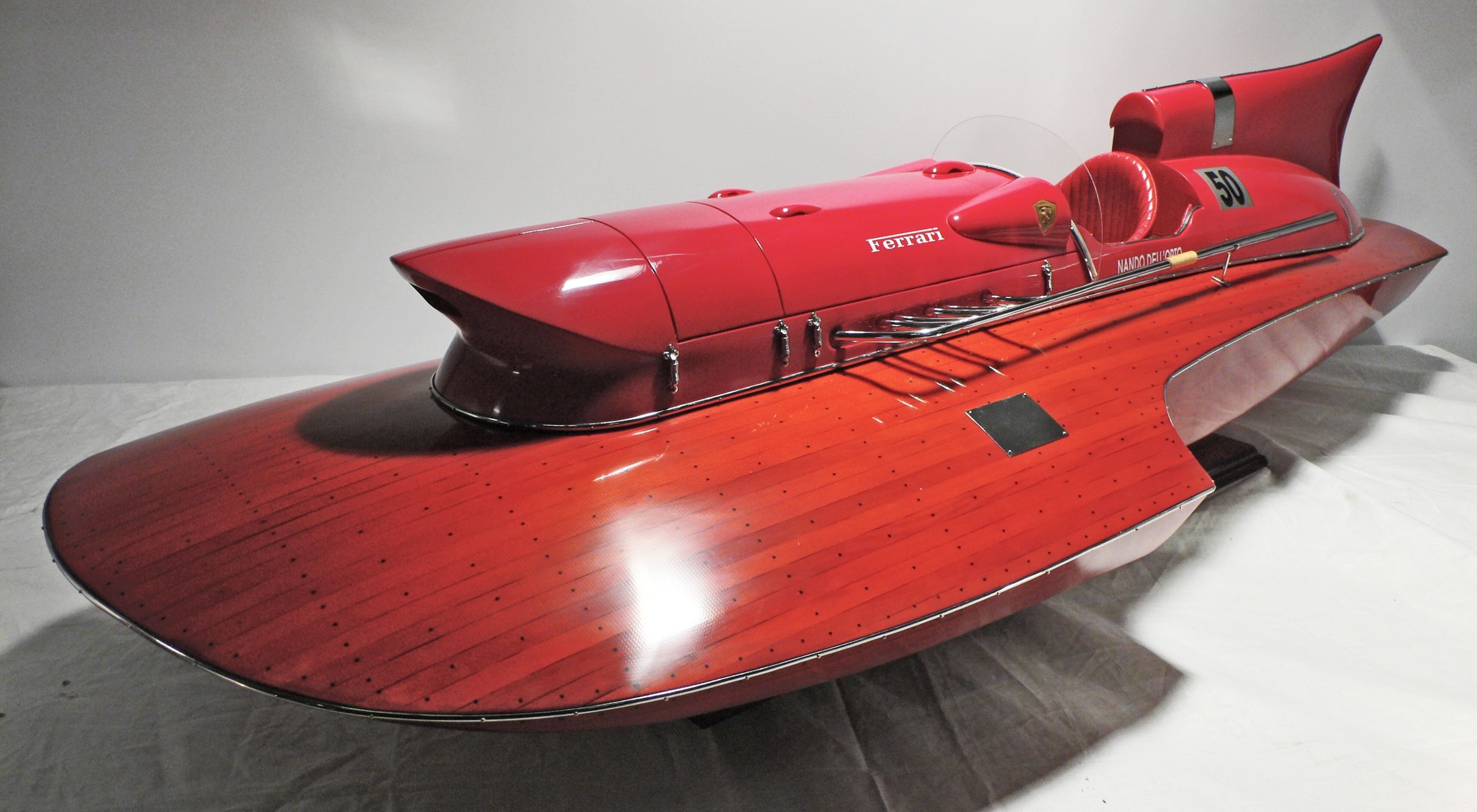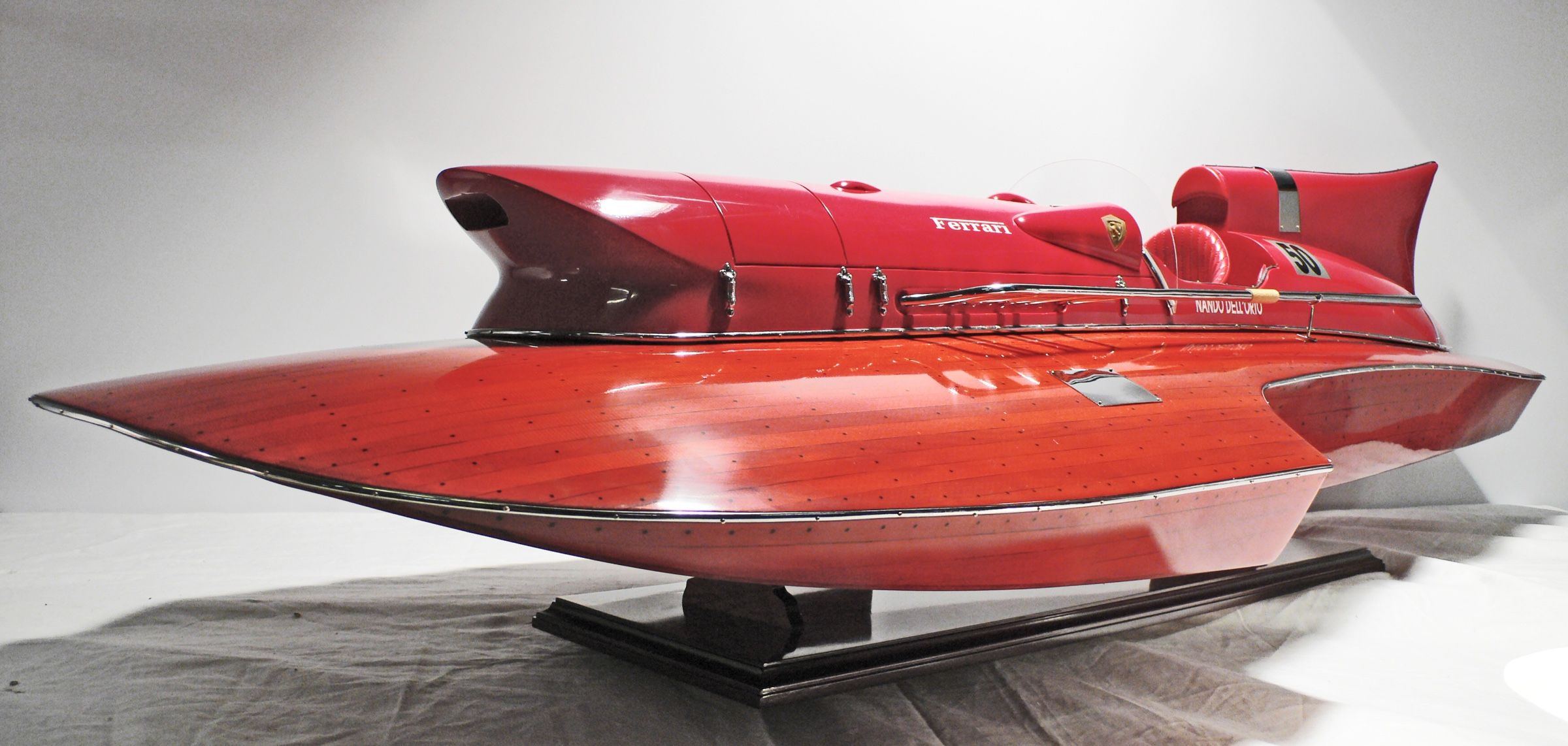 Bei dem dargestellten Schiffsmodell handelt es sich um eine maßstabsgetreue Nachbildung des Ferrari Hydroplane 1954.