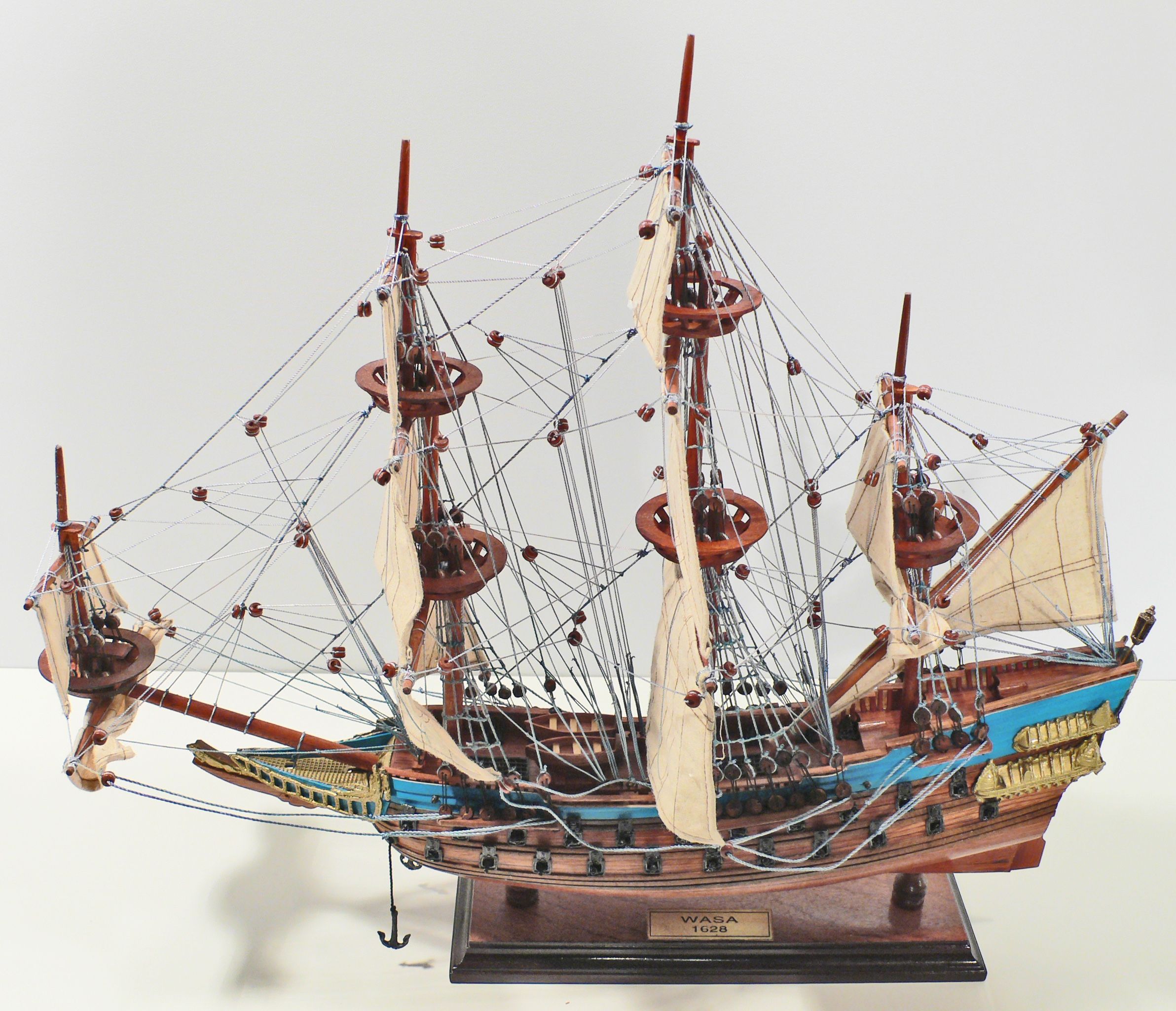 Bei dem dargestellten Schiffsmodell handelt es sich um eine maßstabsgetreue Nachbildung der Wasa. Dieses Modell wurde zu 100% in reiner Handarbeit und Präzision mit traditioneller Spantenbauweise mit Rumpfbeplankung gefertigt. Dabei finden unter anderem exotische Edelhölzer wie Teak, Mahagoni, Rosenholz oder Mango Verwendung, wodurch sich als Endprodukt ein wertvolles und dekoratives Edelmodell ergibt. Der Rumpf wird nach der Fertigstellung feinsäuberlich geschliffen und sofern vorgesehen lackiert. Das Modell wird danach mit einem schätzenden Klarlack beschichtet. Ornamente und Verzierungen (z.B. Kanonen, Bullaugen, Anker, Zifferblätter und Räder …) sind aus Messing, Chrom oder anderen hochwertigen Metallen. Die Segel sind aus Stoff oder Seide, die Masten aus Holz und das Tauwerk aus soliden Baumwollfäden. Manche dieser Seile haben Spezialknoten, mit denen die Seile jederzeit nachgespannt werden können. Unsere Modelle durchlaufen eine strikte Qualitätskontrolle, damit wir Ihnen ein fehlerfreies Produkt bieten können. Die Zufriedenheit unserer Kunden hat unsere höchste Priorität. Alle Modelle werden vollständig zusammengebaut ausgeliefert.